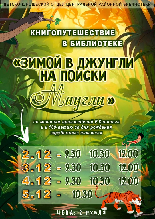 Со 2-го по 5-го декабря сотрудники детско-юношеского отдела центральной районной библиотеки приглашали воспитанников детского сада № 2 «Пралеска» и детского сада № 3 «Солнышко», а также первоклассников средней школы им. М.В. Октябрьской и базовой школы им. И.А. Авекова г.п. Лиозно в увлекательное книгопутешествие «Зимой в джунгли на поиски Маугли», посвящённое 160-летию со дня рождения Джозефа Редьярда Киплинга, английского писателя, поэта и новеллиста, лауреата Нобелевской премии по литературе,