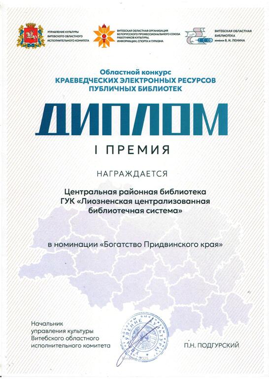 В номинации «Богатство Придвинского края» информационный ресурс – краеведческая база данных Лиозненской центральной районной библиотеки «Лиозненщина известная и неизвестная» был отмечен Дипломом І степени.