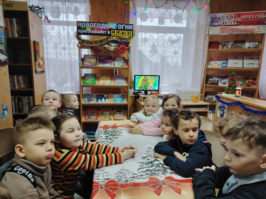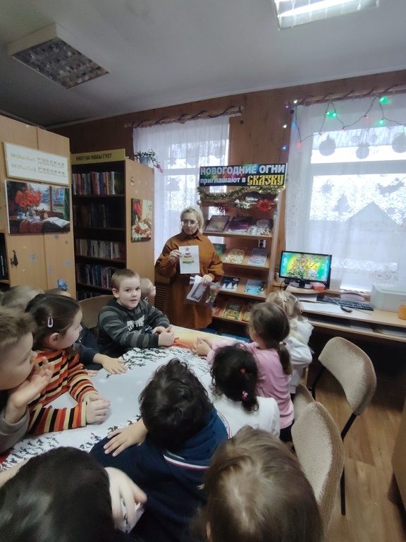 Библиотекарь Наталья Егорова познакомила дошкольников с историей появления главного зимнего волшебника, рассказала, где он живёт, познакомила с литературой, представленной на выставке «Новогодние огни приглашают в сказку».