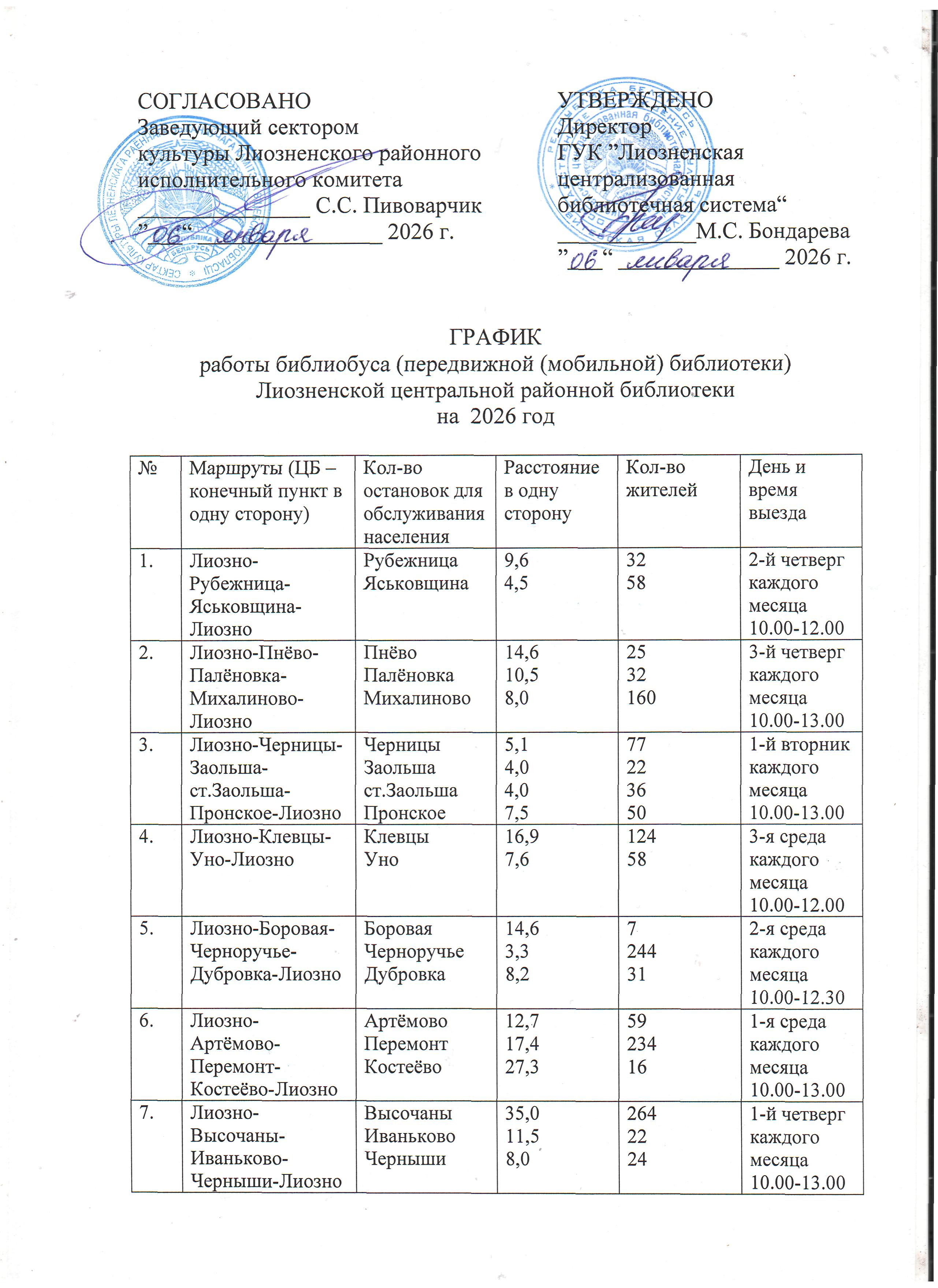 С 2006 года в составе отдела обслуживания и информации Лиозненской центральной районной библиотеки для обслуживания населения отдалённых деревень работает библиобус.