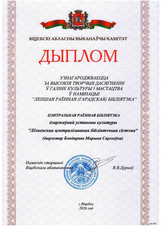 Дипломом Витебского областного исполнительного комитета за высокие творческие достижения в отрасли культуры и искусства в номинации «Лучшая районная (городская) библиотека» была награждена Лиозненская центральная районная библиотека в лице директора Бондаревой Марины Сергеевны.